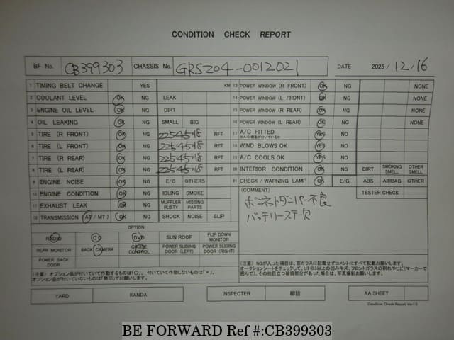 | Chassis No. | GRS204-0012021 | Engine Code | 2GR |