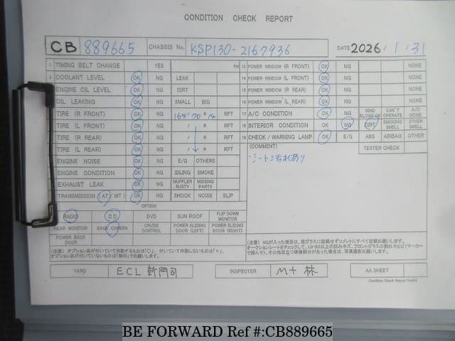 | Chassis No. | KSP130-2167936 | Engine Code | 1KR |